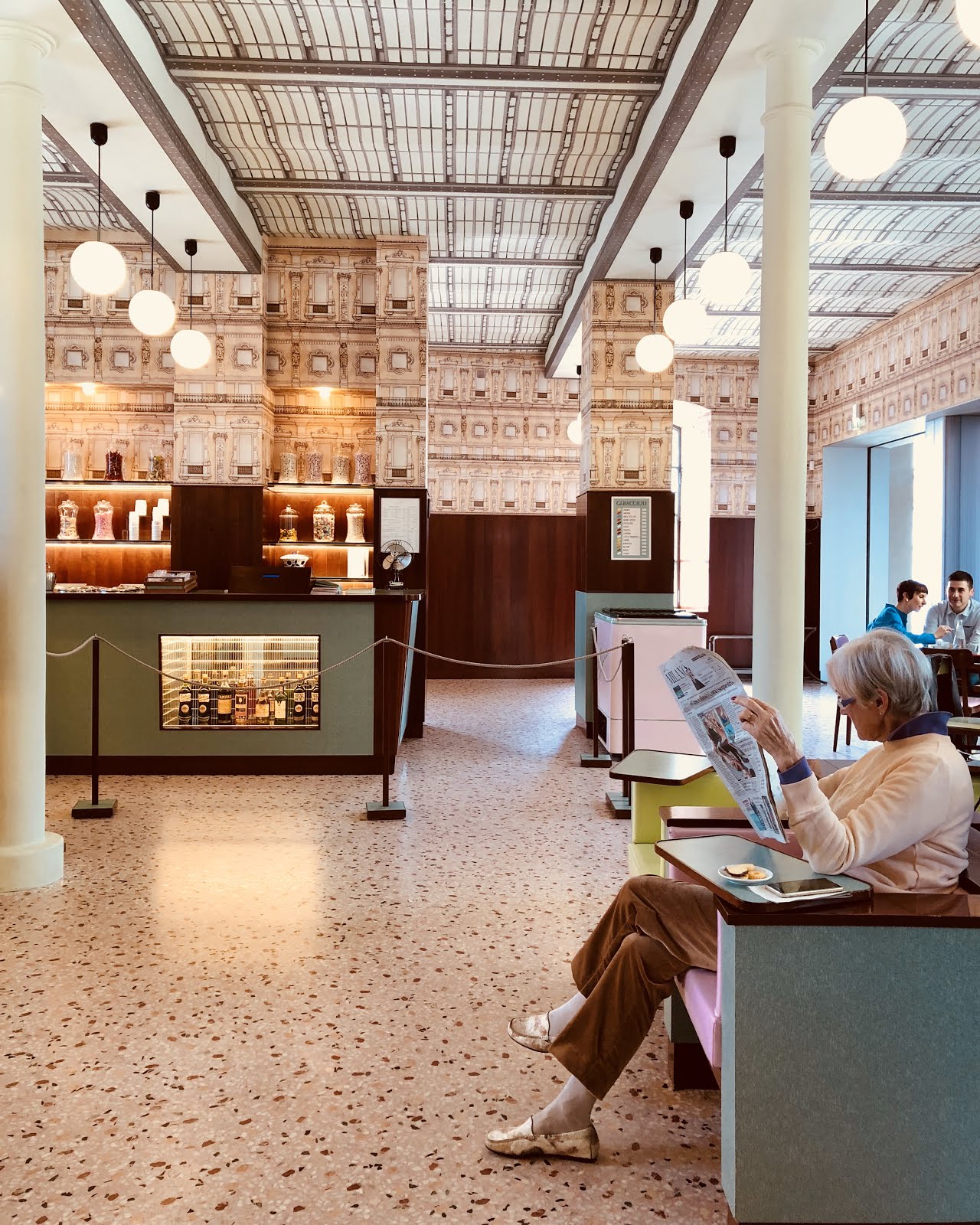 這間 BAR LUCE 的內外靈感,來自50年代經典的米蘭咖啡廳與兩部與米蘭息息相關的舊電影 (Miracolo a Milano 和 Rocco E I Suoi Fratelli),濃濃的懷舊風格隱藏著導演的小心機,連彈珠機都不放過,要用來宣傳一下自己的舊作品。這間老派的米蘭咖啡廳保留了原有的建築元素,貼滿了花紋牆紙,模仿一下華麗的裝潢和標誌性玻璃拱廊-the Galleria Vittorio Emanuele II,米蘭地標之一。